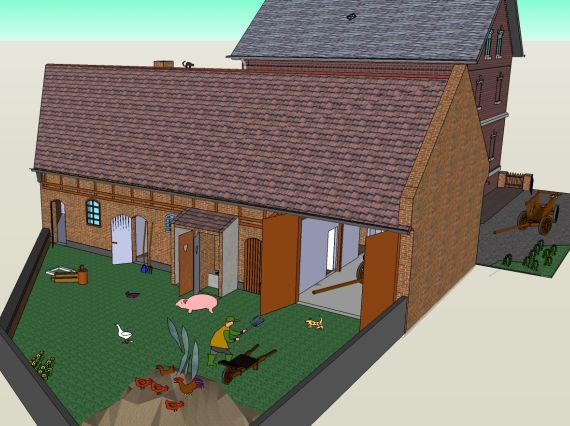 Das Grundstück hinter dem Haus wurde offensichtlich nicht als Hausgarten genutzt. Das Gelände ist mit etwa 30 cm Schotter bzw. Asche aufgefüllt worden. Nach mündlicher Überlieferung befand sich dort der Misthaufen. Man friedete man das Grundstück mit einer halbsteinigen Mauer ein. Dort wurde auch Kleinvieh wie Hühner und Enten gehalten. Im Garten befand sich auch eine Sickergrube für die aus den Stallungen abfließende Jauche. Am Hinterhaus befand sich der Anbau mit den Aborten, die "Plumpsklos". Die Abortgrube musste natürlich mit einem Schöpfeimer regelmäßig geleert werden. Die Fäkalien wurden dann in den eigentlichen Garten zum Düngen gefahren. Der Hausgarten und die bewirtschafteten Felder waren nicht am Haus, sondern an anderer Stelle. Nach den im Stall gefundenen alten Gerätschaften wurden neben Gemüse, Kartoffeln, Getreide und auch Spargel angebaut. |