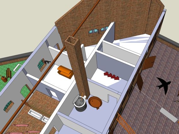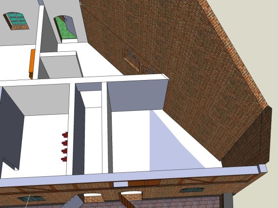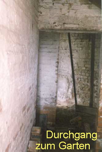 ![]() Durch diesen Gang konnte man vom Innenhof in den Garten gehen. In der Mitte war eine Nische, von der man über eine Leiter und eine Falltür auf den Boden klettern konnte. Im hinteren Teil des Ganges war ein dreieckiger Raum, der als Holzlager diente. Die Wände im unbewohnten Teil des Hinterhauses waren gekalkt und hatten eine Decke mit Lehmschlag. |