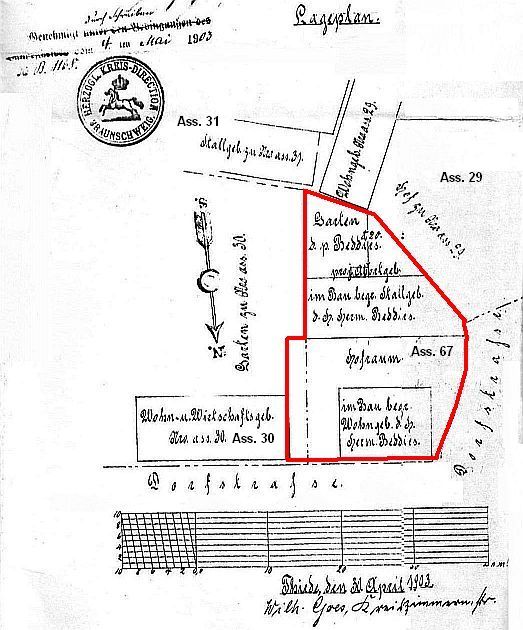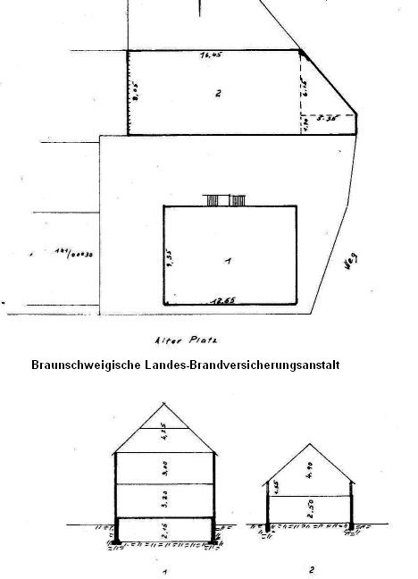 Die heutige Bezeichnung "Alter Platz" gab es nicht. Die Straße wurde als "Dorfstraße" bezeichnet, der heutige "Alte Weg" damals als "Alte Wolfenbüttler Heerstraße". Diese Straße war eine wichtige Fernstraße und setzte früher sich über den heutigen "Feldweg" am Lecheln Holz bis Wolfenbüttel und weiter fort. Bei dem großen Bombenangriff 1944 auf Braunschweig verbrannten alle dort gelagerten Dokumente und Urkunden des Landkreises, so auch die Baupläne Hauses. Was noch existiert, ist durch glückliche Umstände den Flammen entkommen. |