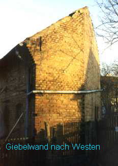 ![]() Die Giebelwand nach Westen war bauchig ausgebeult und an einigen Stellen zeigten sich Risse. Die Wand ist im Bereich des jetzigen Abstellraums erhalten, so auch die beiden Fenster. Diese Fenster wurden restauriert und neu verglast. |