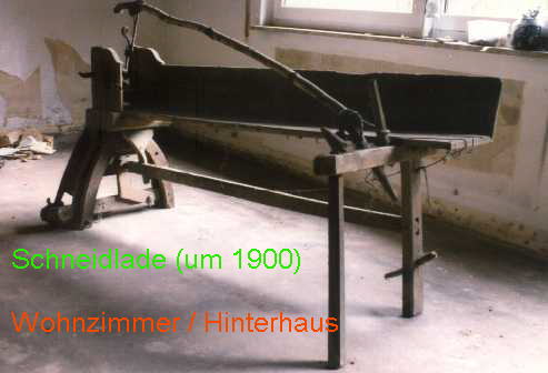 ![]() Dachbodenfund - Eine hölzerne Maschine - eine Schneidlade - zum Zerkleinern von Stroh (Häckseln) für die Fütterung - jetzt im Bestand des Landtechnik-Museum Braunschweig Gut Steinhof e.V. Wir befinden uns im ehemaligen Schweinestall - zu dem Zeitpunkt Wohnzimmer der Hinterhauswohnung. Die Zentralheizung und der Dielenboden sind bereits ausgebaut worden. |